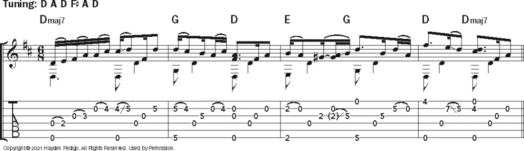 While Pedigo admits to being somewhat freewheeling when it comes to using alternate tunings, for his composition “Tints of Morning” he opts for the decidedly conventional choice of open D. The guitarist seeks beauty in his work, and this piece is no exception with its hints of a Dmaj7 chord. Pedigo plays a full performance of “Tints of Morning” in a video from AG’s Sessions in Place series. To play along, tune slightly sharp and place a capo at the first fret. —AP