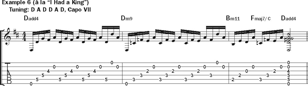 Example 6 is inspired by Mitchell’s “I Had a King,” from her early album Song to a Seagull (1968). According to the Joni Mitchell Complete So Far… songbook, the original track uses the tuning E B E E B E with a capo at the fifth fret; in this example, you get the same open string pitches by tuning to D A D D A D (like DADGAD, but with string 3 tuned down to unison with string 4) with a capo at the seventh fret. The example consists of steady 16th notes, arranged in a series of arpeggios that create a syncopated pattern. Note how simple chord formations here produce colorful harmonies through shifting relationships between fretted notes and open strings. For instance, in the first bar, what would be an open-E shape in standard tuning produces a Dadd4 chord (sounding as Aadd4 due to the capo), and when the shape is moved down two frets it creates a jazzy, close-voiced Dm9 (Am9). Let the notes of each chord ring as long as possible to create a wash of color.